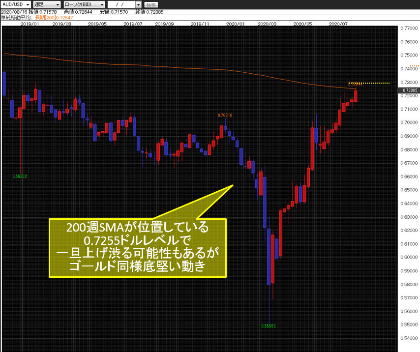 ゴールドの上昇に連れ、静かにドル安が進行。豪ドル/米ドルも0.72ドル台を回復し、本日19日(水)午前11時過ぎ時点で0.7259ドルまで上昇。ユーロ/米ドルも2年ぶりの高値まで上昇。豪ドル/米ドルは200週SMAが位置している0.7255ドルレベルで一旦上げ渋る可能性もあるが、ゴールド同様底堅い動き。遅ればせながら、米ドル/円もドル安の流れに追随。一時105.11円まで下落。マーケットの噂では104.80円割れにストップがあるとのことなので、逆にいえば一旦104.80~105.00円はサポートになる可能性も。戦略的には豪ドル/米ドルの押し目買い、米ドル/円の戻り売りで臨みたい。